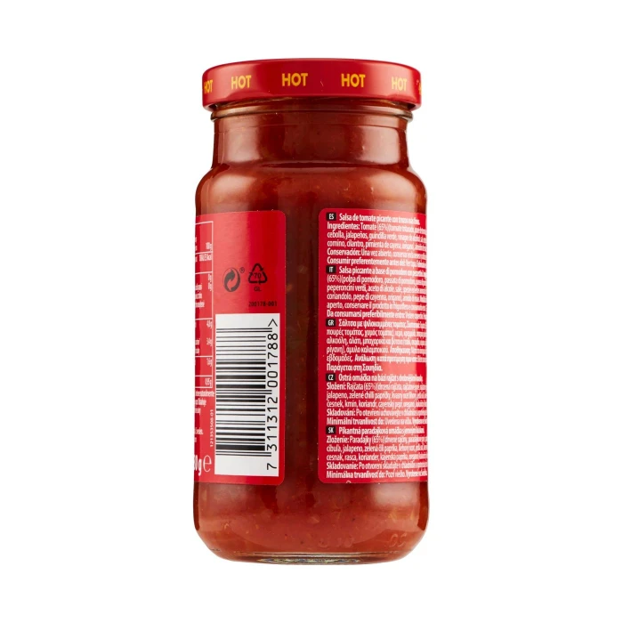 Pomodoro (65%)(polpa di pomodoro, passata di pomodoro, purea di pomodoro), Acqua, Cipolla, Jalapeño, Peperoncini verdi, Aceto di alcole, Sale, Spezie ed erbe aromatiche (peperoncino, aglio, cumino, coriandolo, pepe di cayenna, origano), Amido di mais