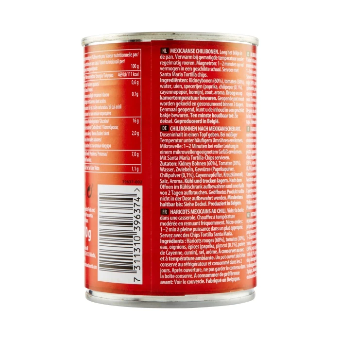 Fagioli rossi (60%), Pomodori (30%), Acqua, Cipolle, Spezie (paprica, peperoncino (0,1%), pepe di cayenna, cumino), Sale, Aromi