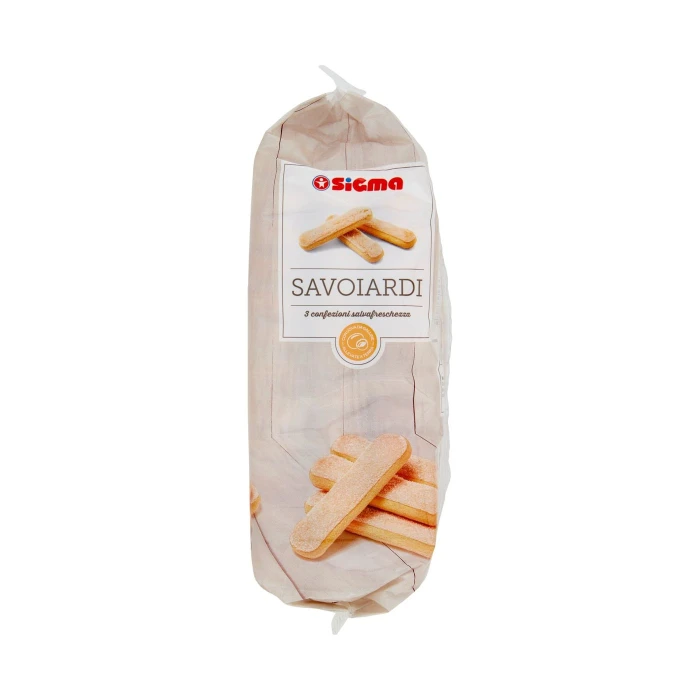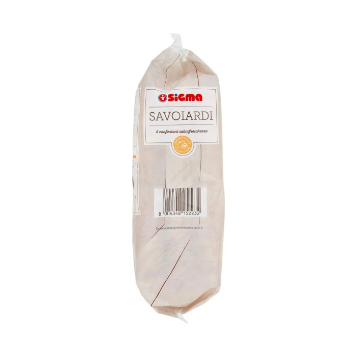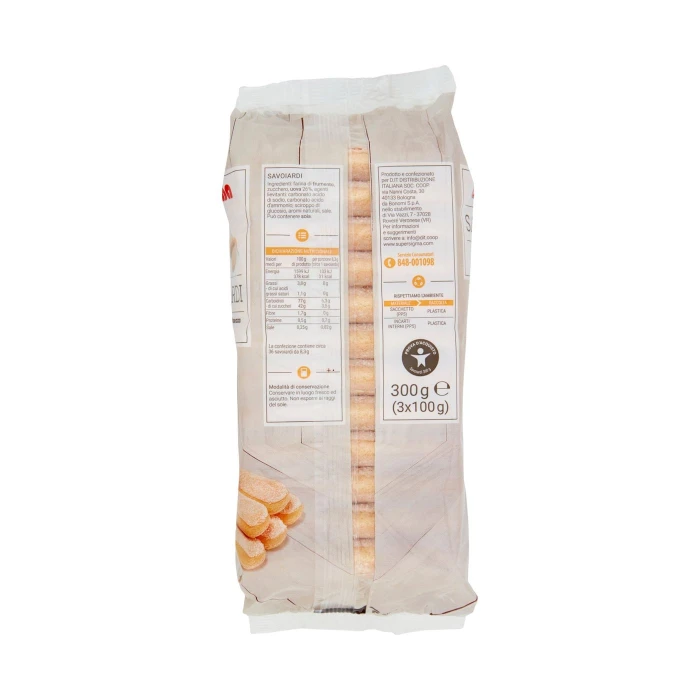 Per 100 g di prodotto - Energia: 1599 kJ: 378 kcal, Grassi: 3,8 g, - di cui acidi grassi saturi: 1,1 g, Carboidrati: 77 g, - di cui zuccheri: 42 g, Fibre: 1,7 g, Proteine: 8,5 g, Sale: 0,25 g, La confezione contiene circa 36 savoiardi da 8,3 g