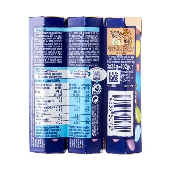 NESTLÉ Smarties Confetti ripieni di Cioccolato al Latte 3 tubi 34 g
