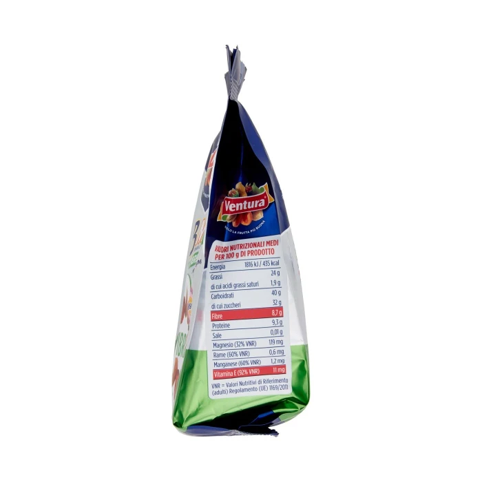 Per 100 g di prodotto - Per 100 g di sgusciato: Energia: 1810 kJ / 434 kcal, Grassi: 24 g, di cui acidi grassi saturi: 1,9 g, Carboidrati: 42 g, di cui zuccheri: 32 g, Fibre: 8,0 g, Proteine: 9,1 g, Sale: 0,01 g, Vitamina E: 10,6 mg, Rame: 0,58 mg, Manganese: 1,69 mg, VNR: Valori Nutritivi di Riferimento (adulti) Regolamento (UE) 1169/2011 VNR: Energia, Grassi, di cui acidi grassi saturi, Carboidrati, di cui zuccheri, Fibre, Proteine, Sale, Vitamina E: 88%, Rame: 58%, Manganese: 84%, VNR: Valori Nutritivi di Riferimento (adulti) Regolamento (UE) 1169/2011