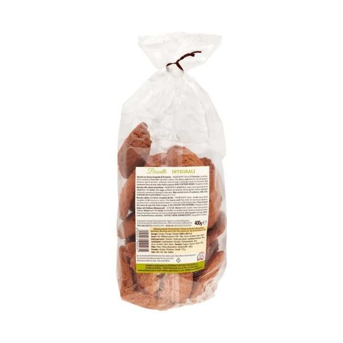 Farina di frumento, Zucchero, Farina integrale di frumento macinata a pietra 14%, Burro, Uova fresche, Olio di girasole, Destrosio, Agenti lievitanti: carbonato acido di sodio, carbonato acido di ammonio, Può contenere tracce di soia, latte, frutta a guscio, Non contiene aromi