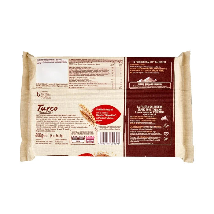 Per 100 g di prodotto - 100 g: Energia: 1973 kJ, : 471 kcal, Grassi: 19,5 g, di cui Acidi Grassi Saturi: 4,7 g, Acidi Grassi Monoinsaturi: 12,7 g, Acidi Grassi Polinsaturi: 2,1 g, Carboidrati: 62,5 g, di cui Zuccheri: 17,2 g, Fibre*: 6,0 g, Proteine: 8,3 g, Sale: 1,3 g, *determinate secondo il metodo AOAC 991.43 e AOAC 997.08, Contiene 60 biscotti 1 Biscotto 6,7 g: Energia: 133 kJ, : 32 kcal, Grassi: 1,3 g, di cui Acidi Grassi Saturi: 0,3 g, Acidi Grassi Monoinsaturi: 0,9 g, Acidi Grassi Polinsaturi: 0,1 g, Carboidrati: 4,2 g, di cui Zuccheri: 1,2 g, Fibre*: 0,4 g, Proteine: 0,6 g, Sale: 0,09 g, *determinate secondo il metodo AOAC 991.43 e AOAC 997.08, Contiene 60 biscotti