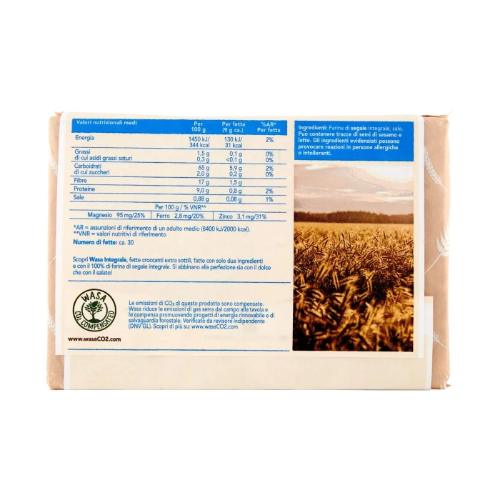 Per 100 g di prodotto - Per 100 g: Energia : 1450 kJ/, : 344 kcal, Grassi : 1,5 g, di cui acidi grassi saturi : 0,3 g, Carboidrati : 65 g, di cui zuccheri : 2,0 g, Fibre : 17 g, Proteine : 9,0 g, Sale : 0,88 g, Magnesio : 95 mg, Ferro : 2,8 mg, Zinco : 3,1 mg, *AR = assunzioni di riferimento di un adulto medio (8400 kJ/2000 kcal), **VNR = valori nutritivi di riferimento, Numero di fette: ca. 30 % VNR**: Energia , , Grassi , di cui acidi grassi saturi , Carboidrati , di cui zuccheri , Fibre , Proteine , Sale , Magnesio : 25%, Ferro : 20%, Zinco : 31%, *AR = assunzioni di riferimento di un adulto medio (8400 kJ/2000 kcal), **VNR = valori nutritivi di riferimento, Numero di fette: ca. 30 Per fetta (9 g ca.): Energia : 130 kJ/, : 31 kcal, Grassi : 0,1 g, di cui acidi grassi saturi : <0,1 g, Carboidrati : 5,9 g, di cui zuccheri : 0,2 g, Fibre : 1,5 g, Proteine : 0,8 g, Sale : 0,08 g, Magnesio , Ferro , Zinco , *AR = assunzioni di riferimento di un adulto medio (8400 kJ/2000 kcal), **VNR = valori nutritivi di riferimento, Numero di fette: ca. 30 %AR* Per fetta: Energia : 2%, , Grassi : 0%, di cui acidi grassi saturi : 0%, Carboidrati : 2%, di cui zuccheri : 0%, Fibre , Proteine : 2%, Sale : 1%, Magnesio , Ferro , Zinco , *AR = assunzioni di riferimento di un adulto medio (8400 kJ/2000 kcal), **VNR = valori nutritivi di riferimento, Numero di fette: ca. 30