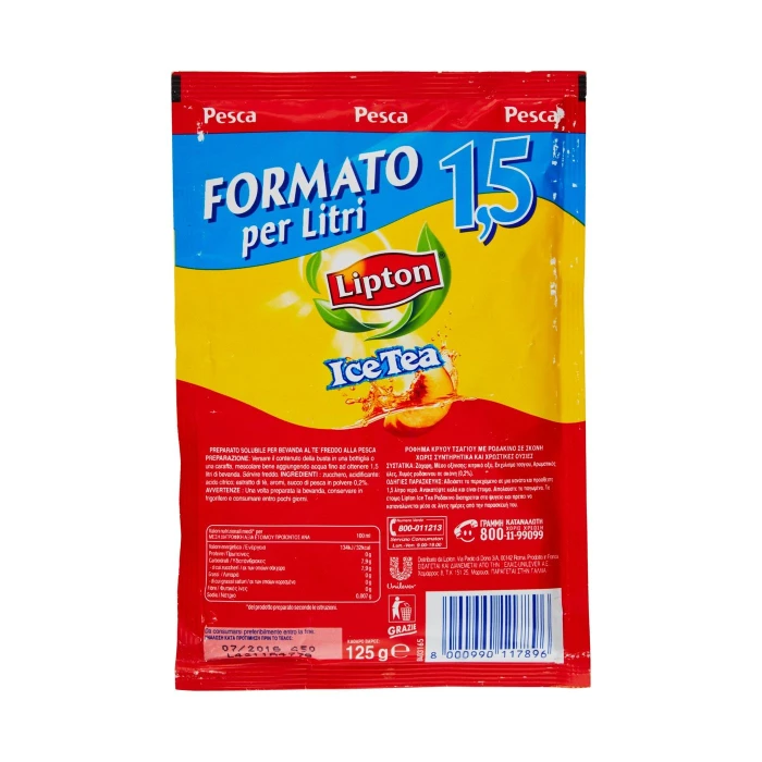 Zucchero, Acidificante: acido citrico, Estratto di tè, Aromi, Succo di pesca in polvere 0,2%