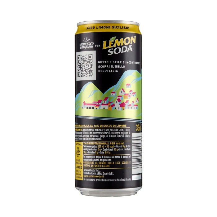 Acqua minerale naturale Fonti di Crodo-Lisiel, Succo di limone e succo di limone da concentrato (12%), Zucchero, Sciroppo di glucosio-fruttosio, Anidride carbonica, Polpa di limone (0,06%), Aroma naturale di limone con altri aromi naturali