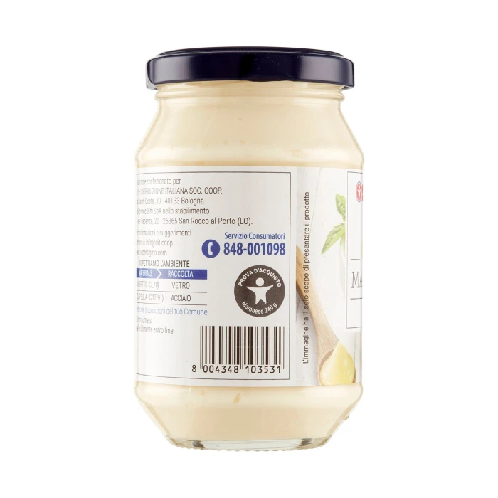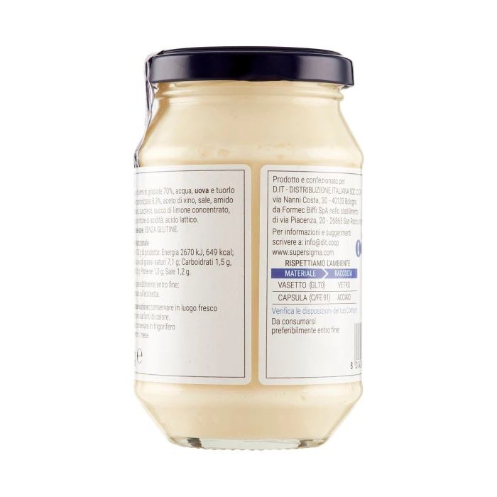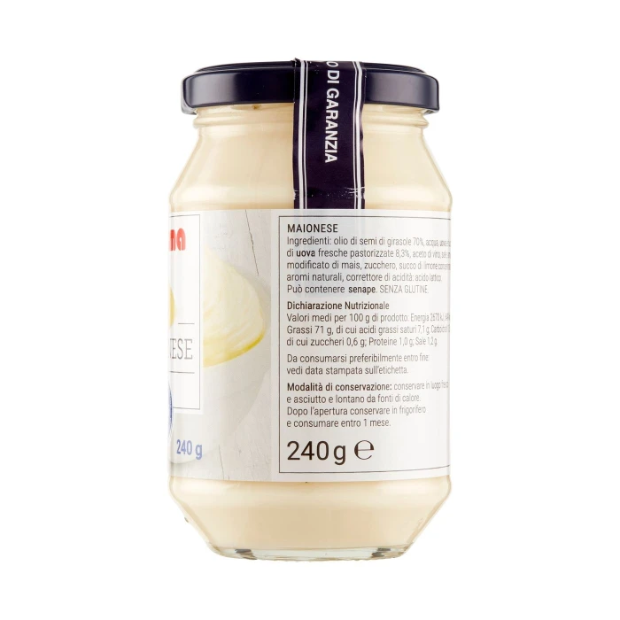 Olio di semi di girasole 70%, Acqua, Uova e tuorlo di uova fresche pastorizzate 8,3%, Aceto di vino, Sale, Amido modificato di mais, Zucchero, Succo di limone concentrato, Aromi naturali, Correttore di acidità: acido lattico, Può contenere senape, Senza glutine