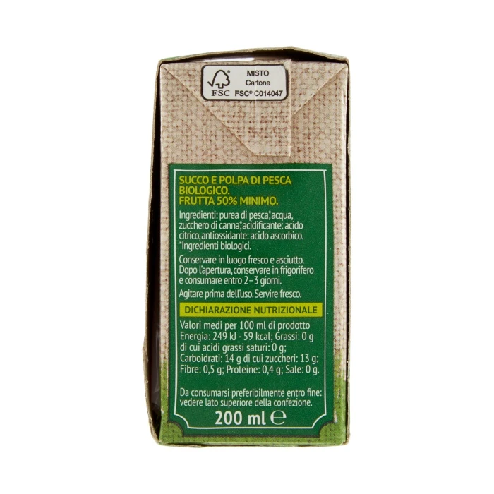 Purea di pesca*, Acqua, Zucchero di canna*, Acidificante: acido citrico, Antiossidante: acido ascorbico, *Ingredienti biologici