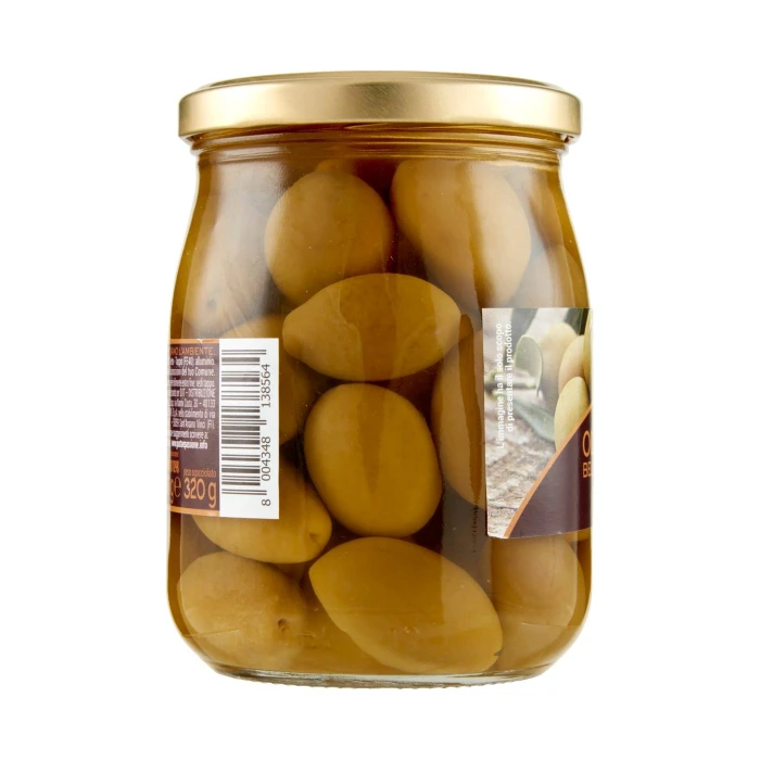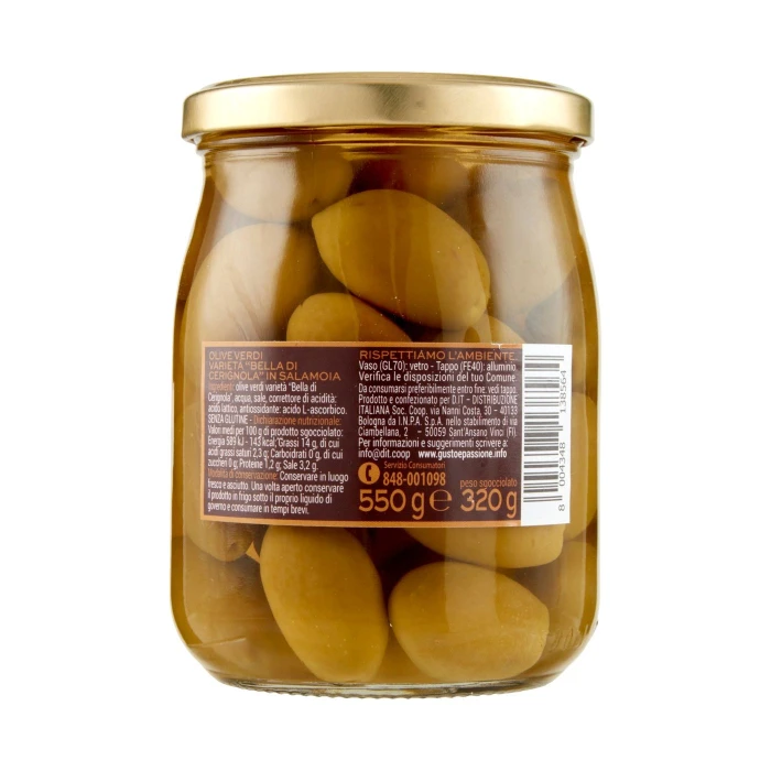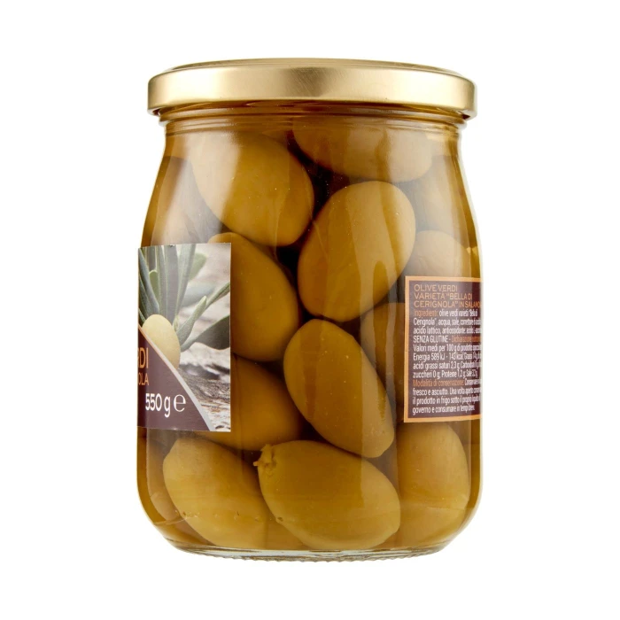Olive verdi varietà Bella di Cerignola, Acqua, Sale, Correttore di acidità: acido lattico, Antiossidante: acido L-ascorbico, Senza glutine