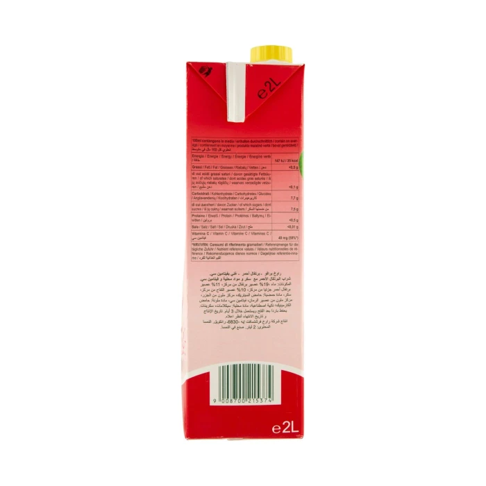 Per 100 g di prodotto - 100ml contengono in media: Energia : 147 kJ / 35 kcal, Grassi : <0,5 g, di cui acidi grassi saturi : <0,1 g, Carboidrati : 7,7 g, di cui zuccheri : 7,5 g, Proteine : <0,5 g, Sale : <0,01 g, Vitamina C : 40 mg, *NRV: Consumi di riferimento giornalieri %*: Energia , Grassi , di cui acidi grassi saturi , Carboidrati , di cui zuccheri , Proteine , Sale , Vitamina C : 50%, *NRV: Consumi di riferimento giornalieri