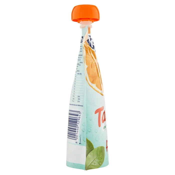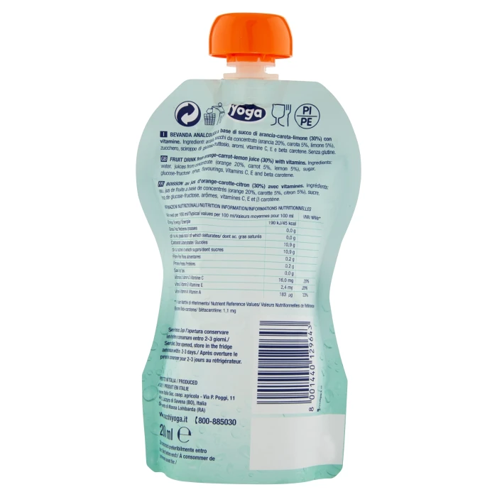 Acqua, Succhi da concentrato (arancia 20%, carota 5%, limone 5%), Zucchero, Sciroppo di glucosio-fruttosio , Aromi, Vitamine C, E e beta carotene , Senza glutine