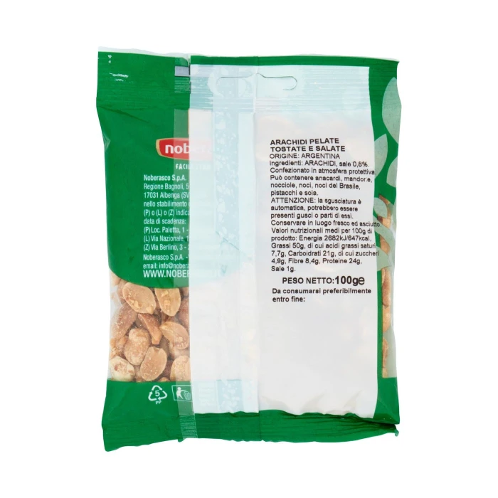 Arachidi, Sale 0,8%, Può contenere anacardi, mandorle, nocciole, noci, noci del Brasile, piastacchi e soia