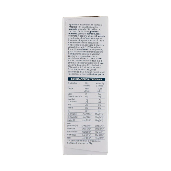 Fiocchi di riso e frumento integrale 44% (riso 50,5% dei fiocchi, frumento integrale 23% dei fiocchi, zucchero, farina di riso, glutine di frumento, germe di frumento, latte scremato in polvere, amido di frumento, estratto di malto d'orzo, sale, agente lievitante: idrogenocarbonato di sodio, emulsionanti: mono-e digliceridi degli acidi grassi), Sciroppo di glucosio, Cioccolato al latte 11,5% (zucchero, burro di cacao, latte intero in polvere, pasta di cacao, emulsionante: lecitina di soia, aroma naturale di vaniglia), Zucchero, Sciroppo di zucchero parzialmente invertito, Malto di orzo e mais, Umidificante: sorbitolo, Olio di girasole, Emulsionante: lecitina di soia, Vitamine [tiammina (B1), riboflavina (B2), niacina (PP), vitamina B6, acido folico (B9), vitamina B12, acido pantotenico (B5)], Minerali (ferro), Aromi, Può contenere tracce di frutta a guscio