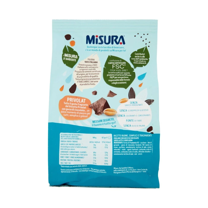 Per 100 g di prodotto - 100 g : Energia : 2021 kJ / 482 kcal, Grassi : 19 g, di cui acidi grassi saturi : 3,6 g, Carboidrati : 68 g, di cui zuccheri : 26 g, Fibre* : 5,1 g, Proteine : 7,1 g, Sale : 0,51 g, *Determinate con metodo AOAC 2009.01 , Questa confezione contiene circa 33 biscotti 8,7 g x 1 frollino: Energia : 177 kJ / 42 kcal, Grassi : 1,7 g, di cui acidi grassi saturi : 0,3 g, Carboidrati : 5,9 g, di cui zuccheri : 2,3 g, Fibre* : 0,4 g, Proteine : 0,6 g, Sale : 0,04 g, *Determinate con metodo AOAC 2009.01 , Questa confezione contiene circa 33 biscotti