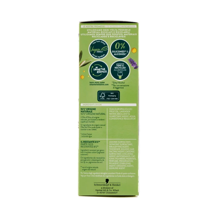 Aqua (Water, Eau), Aqua (Water, Eau), Aqua (Water, Eau), Hydrogen peroxide, Cetearyl alcohol, Cetearyl alcohol, Ammonium hydroxide, Glycerin, Cetearyl alcohol, PEG-40 castor oil, Distearoylethyl Dimonium Chloride, Glyceryl stearate SE, Ceteareth-20, Coco-caprylate, Etidronic acid, Sodium cetearyl sulfate, Sorbitan Caprylate, Octyldodecanol, Sodium laureth sulfate, Guar hydroxypropyltrimonium chloride, 2,6-dicarboxypyridine, Disodium pyrophosphate, Toluene-2,5-diamine sulfate, Olea Europaea (Olive) Fruit oil, Benzyl alcohol, Sodium cetearyl sulfate, Potassium hydroxide, Sodium benzoate, Betaine, Parfum (fragrance), Serine, Arachidyl alcohol, Parfum (fragrance), Potassium hydroxide, Behenyl alcohol, Sodium sulfite, Arachidyl Glucoside, Oleic acid, Dehydroacetic acid, Resorcinol, Limonene, Glycerin, Propylene glycol, Citric acid, Linalool, Etidronic acid, Carbomer, Sodium hydroxide, m-aminophenol, 4-chlororesorcinol, Ascorbic acid, 2,7-naphthalenediol, Linoleamidoropyl PG-Dimonium Chloride Phosphate, 2-methylresorcinol, Sodium sulfate, 2-amino-4-hydroxyethylaminoanisole sulfate, Benzoic acid, Lavandula angustifolia (Lavender) flower extract, Phenoxyethanol, Benzyl alcohol