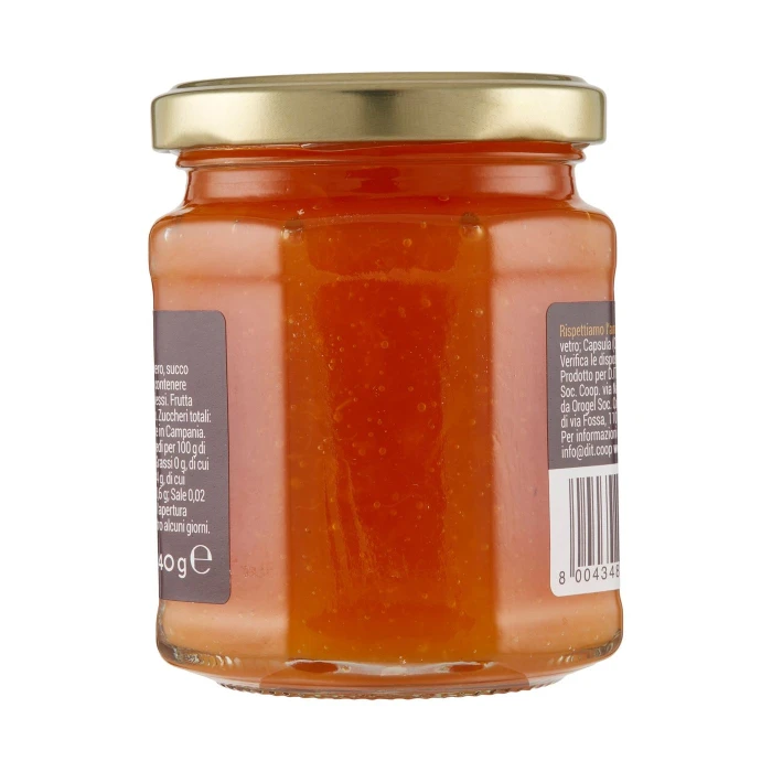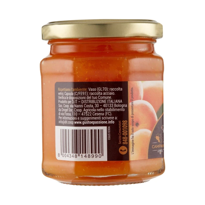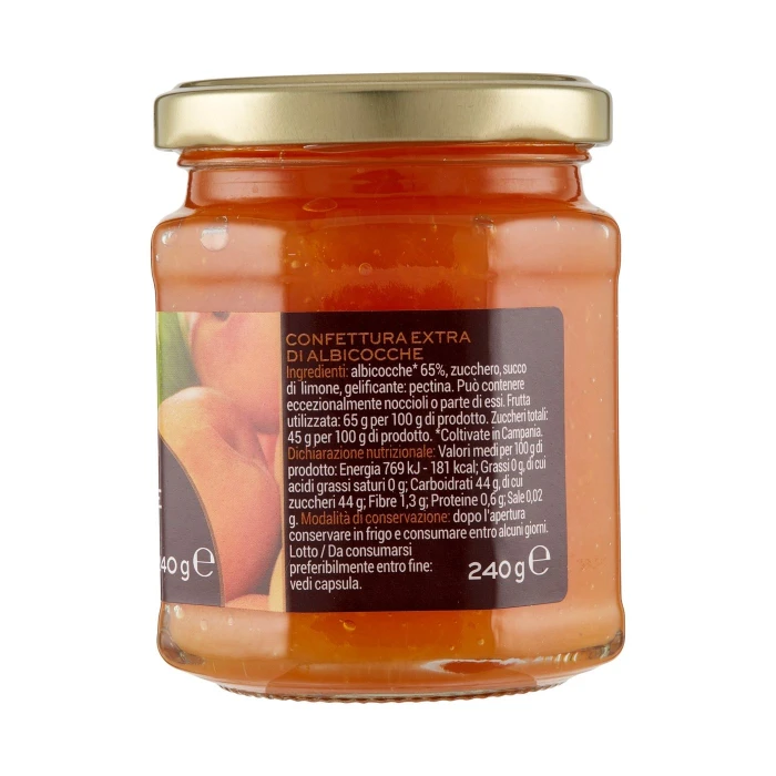 Albicocche* 65%, Zucchero, Succo di limone, Gelificante: pectina, Può contenere eccezionalmente noccioli o parte di essi, Frutta utilizzata: 65 g per 100 g di prodotto, Zuccheri totali: 45 g per 100 g di prodotto, *Coltivate in Campania