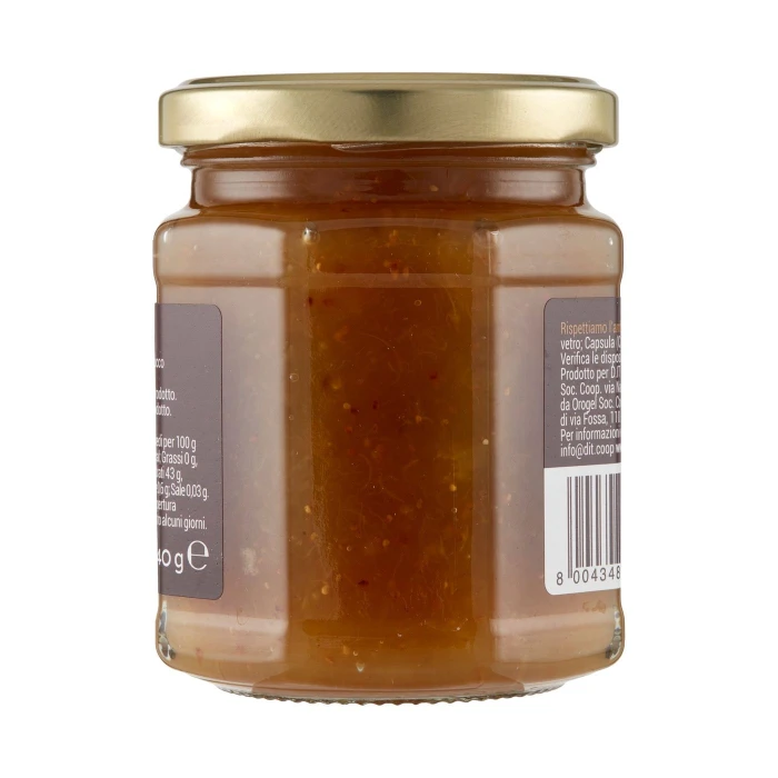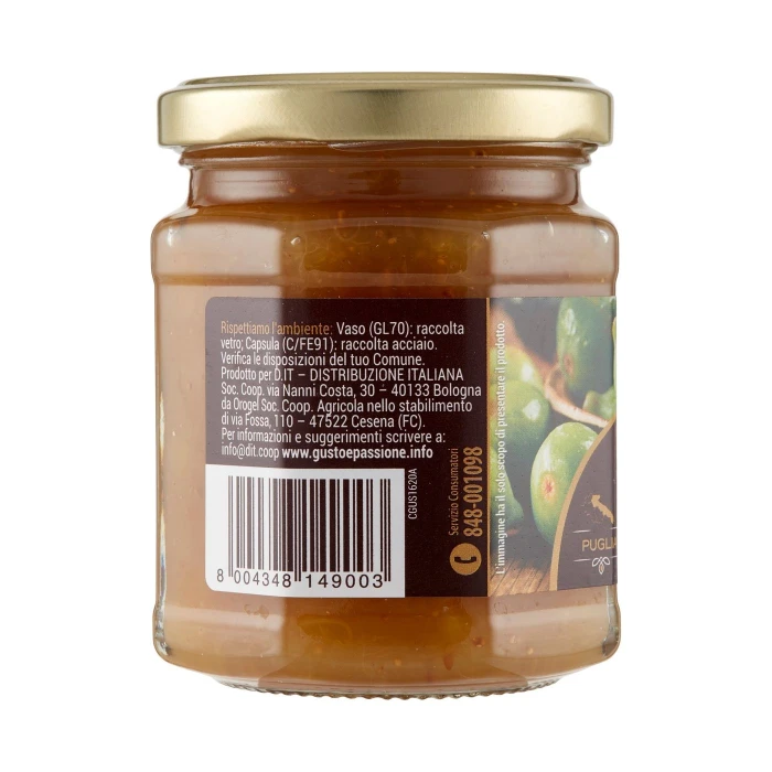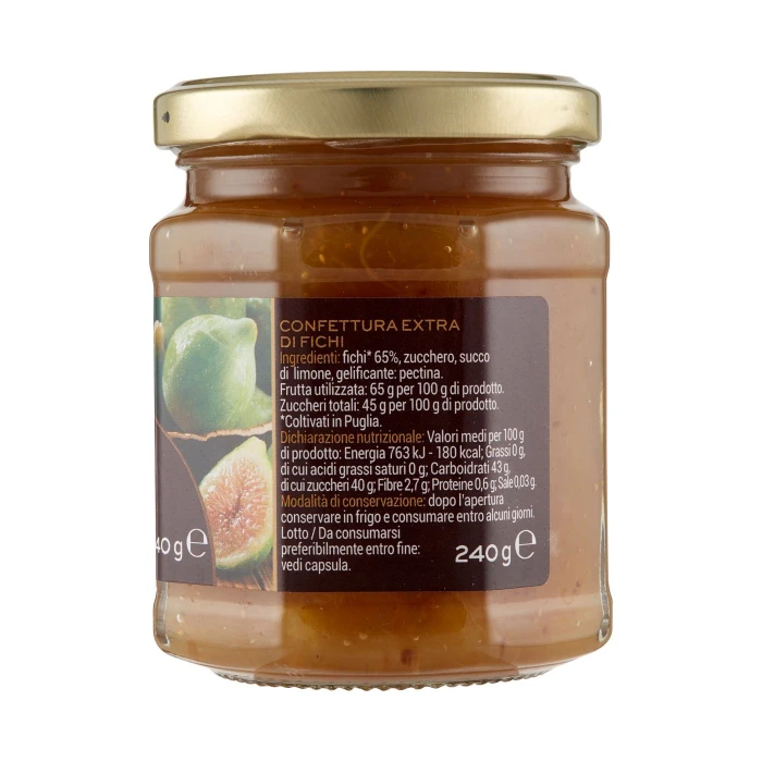 Fichi* 65%, Zucchero, Succo di limone, Gelificante: pectina, Frutta utilizzata: 65 g per 100 g di prodotto, Zuccheri totali: 45 g per 100 g di prodotto, *Coltivati in Puglia