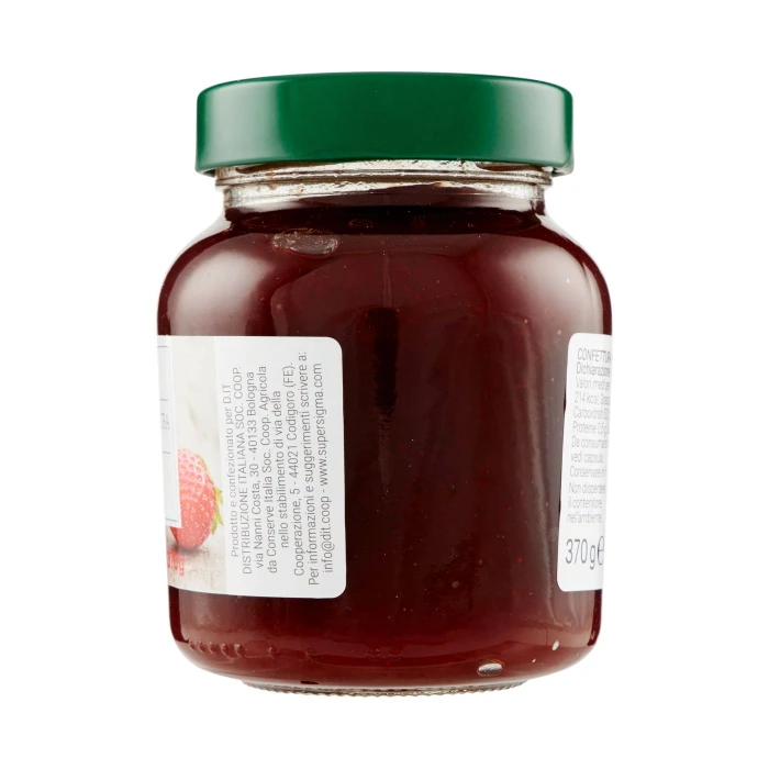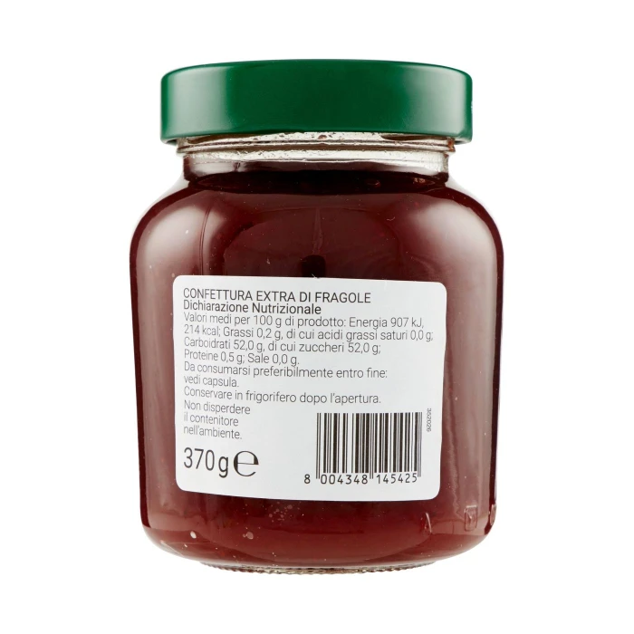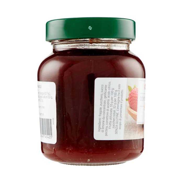 Fragole, Zucchero, Succo di limone da concentrato, Gelificante: pectina, Correttore di acidità: acido citrico, Frutta utilizzata: 55 g per 100 g, Zuccheri totali: 52 g per 100 g, Senza glutine