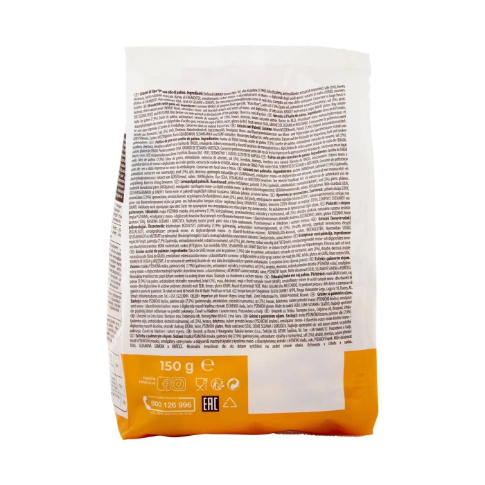 Farina di grano tenero tipo 0, Olio di palma (7,9%) (olio di palma, antiossidante: estratti di rosmarino), Sale (3%), Lievito, Destrosio, Lievito naturale essiccato (farina di frumento), Emulsionante: esteri mono- e diacetiltartarici di mono- e digliceridi degli acidi grassi, Estratto di malto d'orzo, Zucchero, Glutine di frumento, Può contenere soia, semi di sesamo e senape