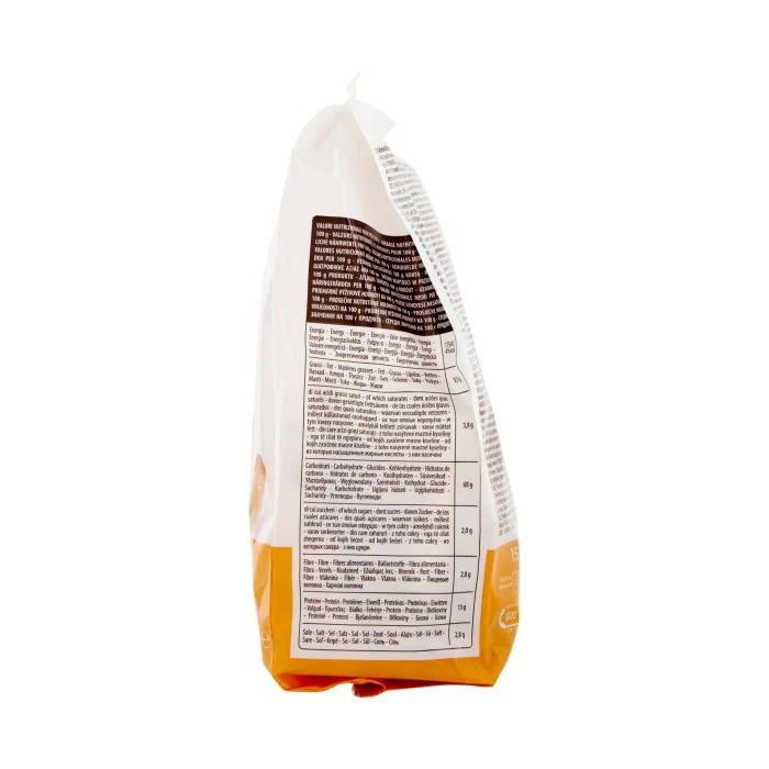 Per 100 g di prodotto - Valori nutrizionali medi per 100 g: Energia : 1754 kJ, : 416 kcal, Grassi : 9,5 g, di cui acidi grassi saturi : 3,8 g, Carboidrati : 68 g, di cui zuccheri : 2,0 g, Fibre : 2,8 g, Proteine : 13 g, Sale : 2,8 g