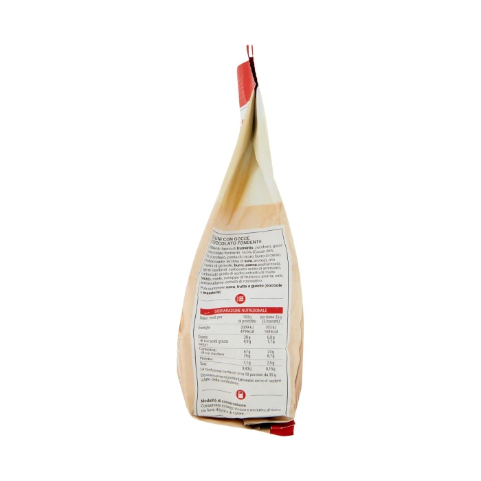 Farina di frumento, Zucchero, Gocce di cioccolato fondente 14,6% (cacao 46% min. zucchero, pasta di cacao, burro di cacao, emulsionante: lecitina di soia, aroma), Olio di semi di girasole, Burro, Panna pastorizzata, Agenti lievitanti: carbonato acido di ammonio, carbonato acido di sodio, Estratto di malto (orzo), Miele, Sciroppo di fruttosio, Aroma, Sale, Antiossidante: estratti di rosmarino, Può contenere uova, frutta a guscio (nocciole e mandorle)