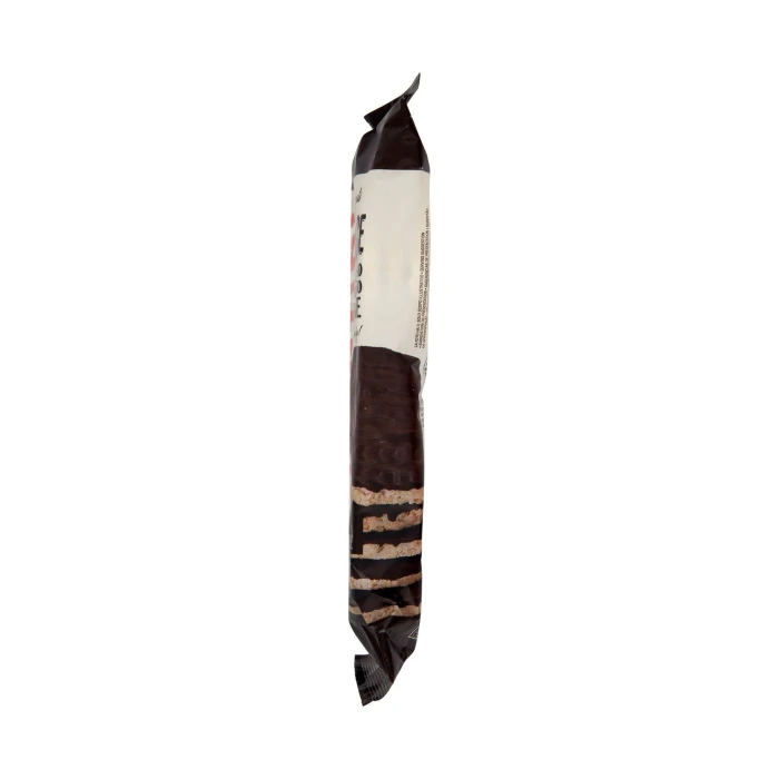 Copertura di cioccolato fondente 60% (zucchero, pasta di cacao, burro di cacao, emulsionante: lecitina di soia, aroma naturale di vaniglia - cacao 52,5% minimo), Galletta di riso 40% (riso) , Può contenere latte e frutta a guscio