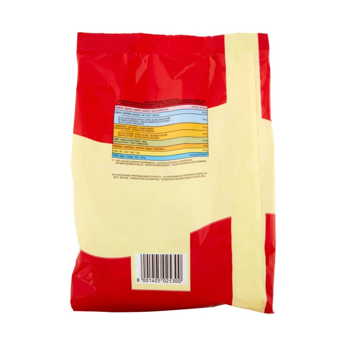 Per 100 g di prodotto - Valori nutrizionali medi per 100 g : Energia : 1757 kJ / 417 kcal, Grassi : 9,7 g, di cui: acidi grassi saturi : 1,8 g, Carboidrati : 71 g, di cui: zuccheri : 1,9 g, Fibre : 2,4 g, Proteine : 10 g, Sale : 2,5 g, Iodio : 78,0 µg, (*) VNR = Valore nutritivo di riferimento VNR*: Energia , Grassi , di cui: acidi grassi saturi , Carboidrati , di cui: zuccheri , Fibre , Proteine , Sale , Iodio : 52%, (*) VNR = Valore nutritivo di riferimento