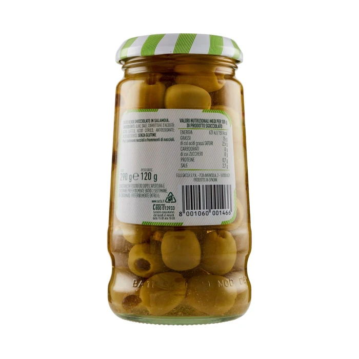 Olive, Sale, Correttore d'acidità: acido lattico, acido citrico, Antiossidante: acido ascorbico, Senza glutine, Può contenere noccioli o frammenti di noccioli