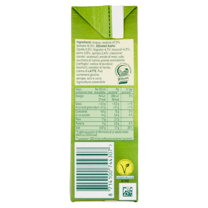 Acqua, Verdure 47,5% (patate 16,3%¹, sedano rapa¹, cipolle 5,5%¹, fagiolini 4,7%¹, broccoli 4,3%¹, porro 3,9%¹, spinaci 2,4%¹, crescione¹, carote¹, acetosa), Amido di mais, Sale, Zucchero di canna, Piante aromatiche (cerfoglio¹, radice di levistico¹, basilico¹), Estratto di lievito, Crema di latte, Può contenere glutine, senape, soia e uova, ¹agricoltura sostenibile