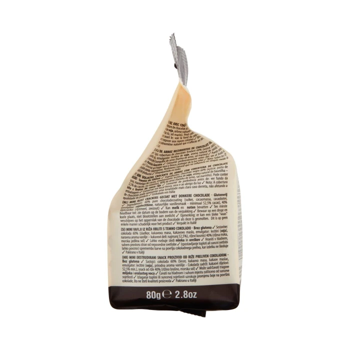 Copertura di cioccolato fondente 60% (zucchero, pasta di cacao, burro di cacao, emulsionante: lecitina di soia, aroma naturale di vaniglia - cacao 52,5% minimo), Cialda di riso 40% (farina di riso, sale marino) , Può contenere latte e frutta a guscio
