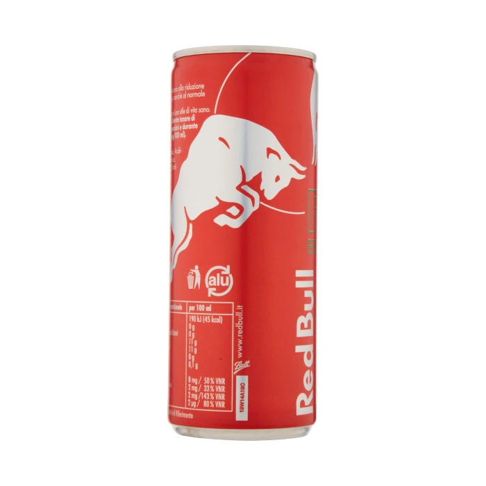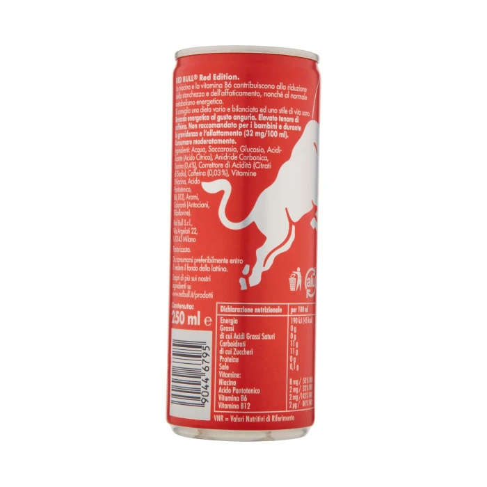 Acqua, Saccarosio, Glucosio, Acidificante (acido citrico), Anidride carbonica, Taurina (0,4%), Correttore di acidità (citrati di sodio), Caffeina (0,03%), Vitamine (niacina, acido pantotenico, B6, B12), Aromi, Coloranti (antociani, riboflavine)