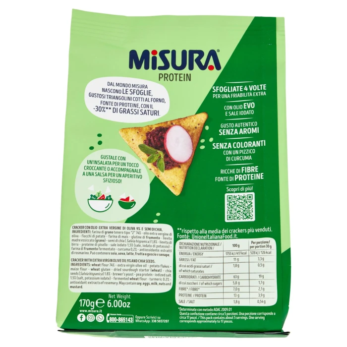 Farina di grano tenero tipo "2" 74%- Olio extra vergine di oliva- Fiocchi di patate- Farina di mais- Glutine di frumento- Lievito madre essiccato (grano)- Semi di chia (Salvia hispanica) 1,8%- Lievito di birra- Proteine di pisello- Sale iodato 1,5% (sale, iodato di potassio)- Farina di frumento fermentato- Curcuma 0,2%- Antiossidante: estratti di rosmarino.