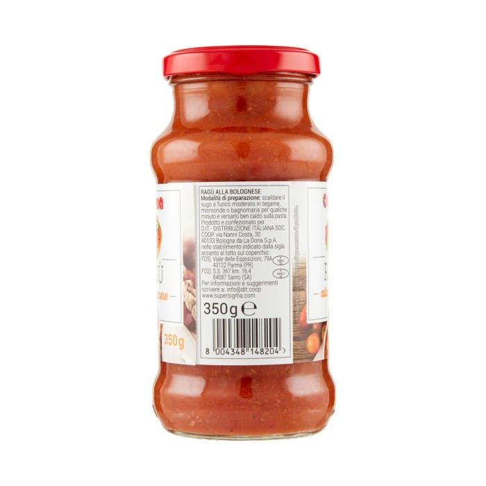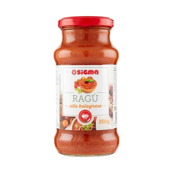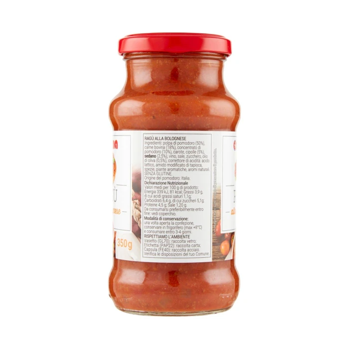 Polpa di pomodoro (50%), Carne bovina (18%), Concentrato di pomodoro (10%), Carote, Cipolle (5%), Sedano (2,5%), Vino, Sale, Zucchero, Olio di oliva (0,5%), Correttore di acidità: acido lattico, Amido modificato di tapioca, Spezie, Piante aromatiche, Aromi naturali, Senza glutine