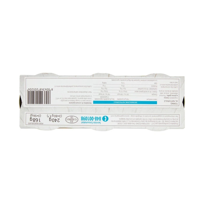 Per 100 g di prodotto - Energia: 351 kJ / 84 kcal, Grassi / di cui acidi grassi saturi: 0,6 g / 0,1 g, Carboidrati / di cui zuccheri: 0 g / 0 g, Proteine: 20 g, Sale: 1,5 g, La confezione contiene 3 porzioni da 56g di prodotto sgocciolato