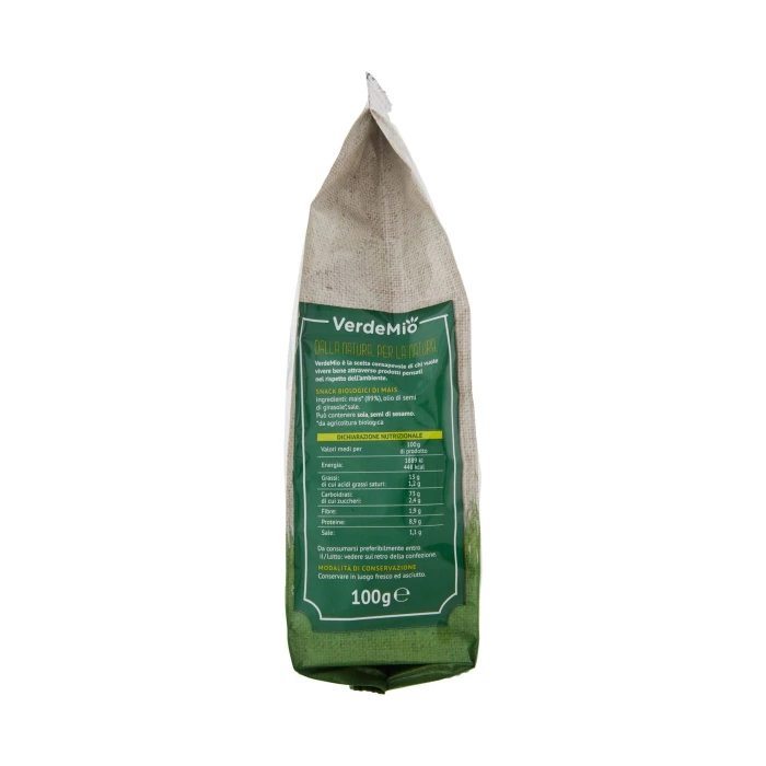 Mais* (89%), Olio di semi di girasole*, Sale, Può contenere soia, semi di sesamo, *da agricoltura biologica